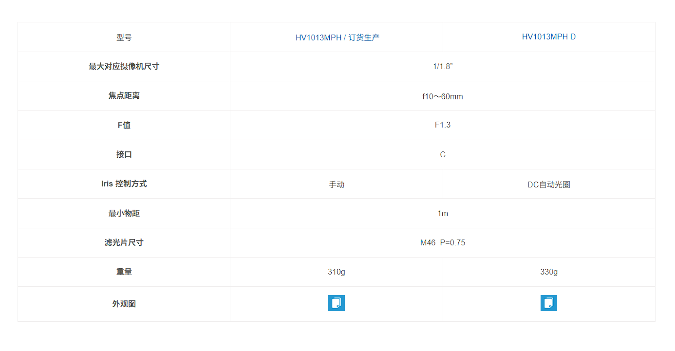 手动变焦镜头 HV1013MPH / JV1216MPH 对应300-500万像素手动变焦镜头