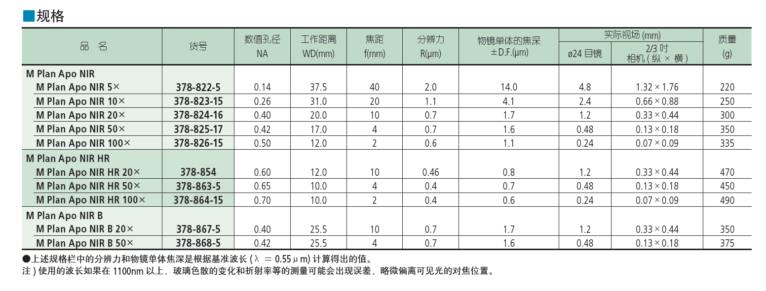 红外物镜明视场用近红外区校正物镜长工作距离物镜M Plan Apo NIR